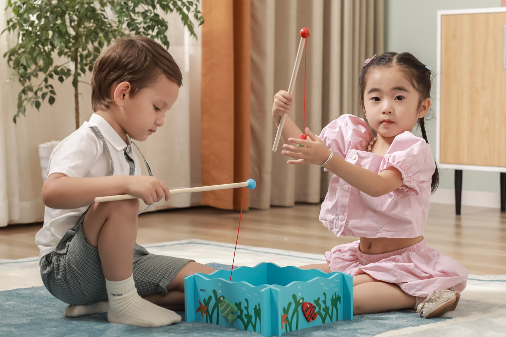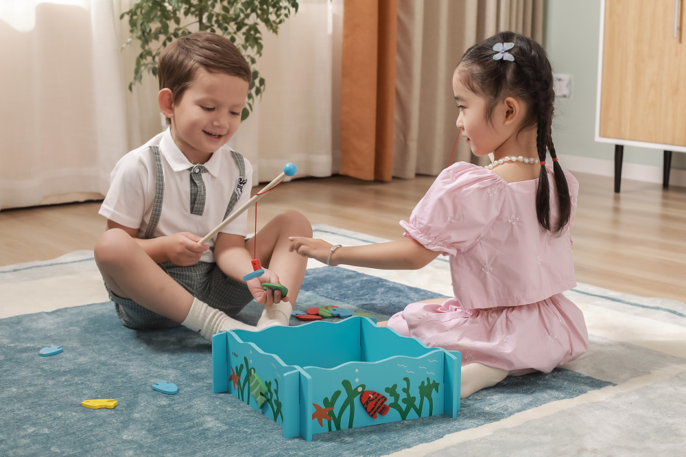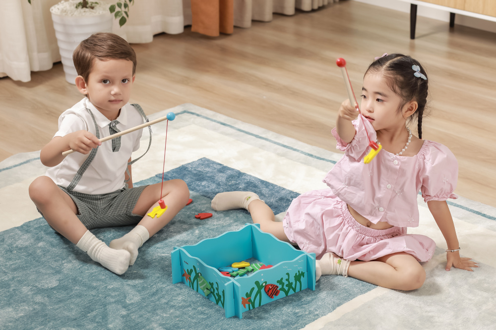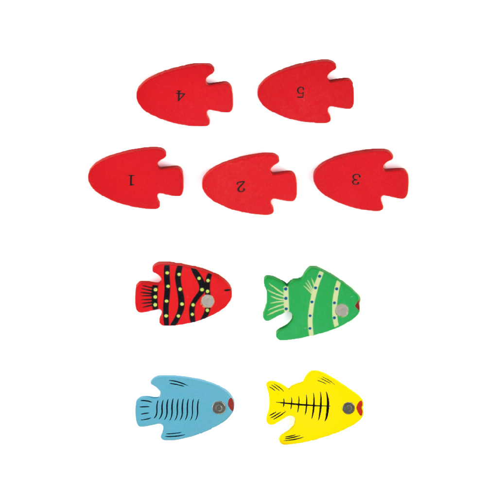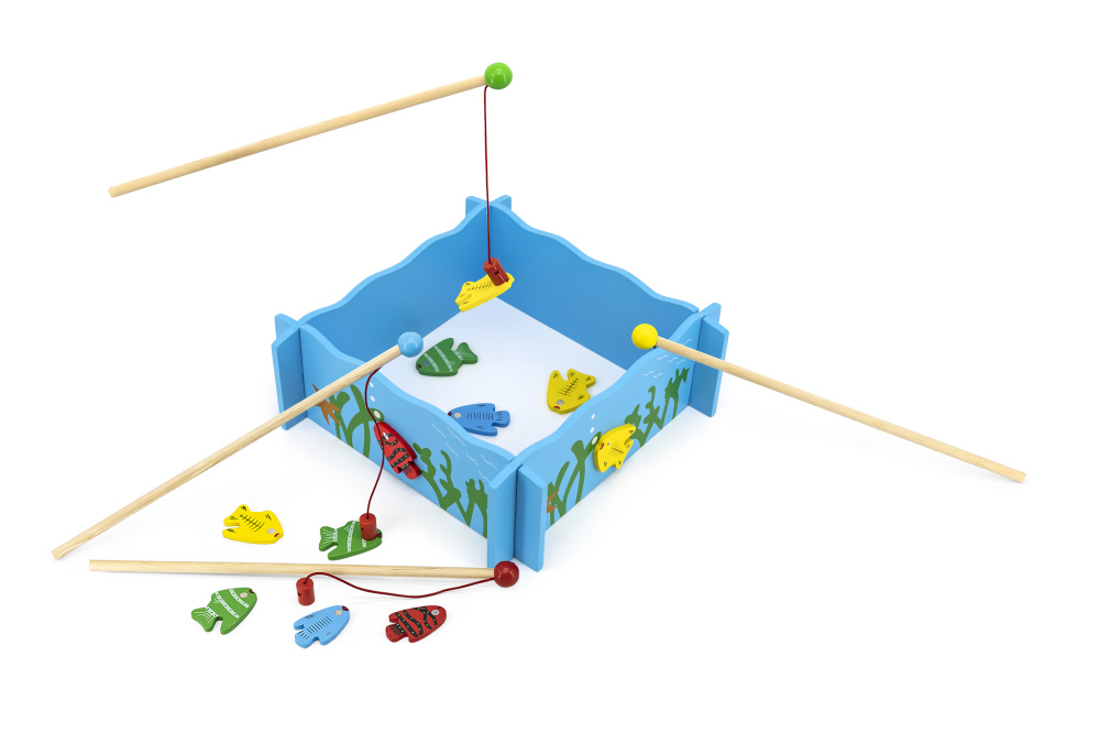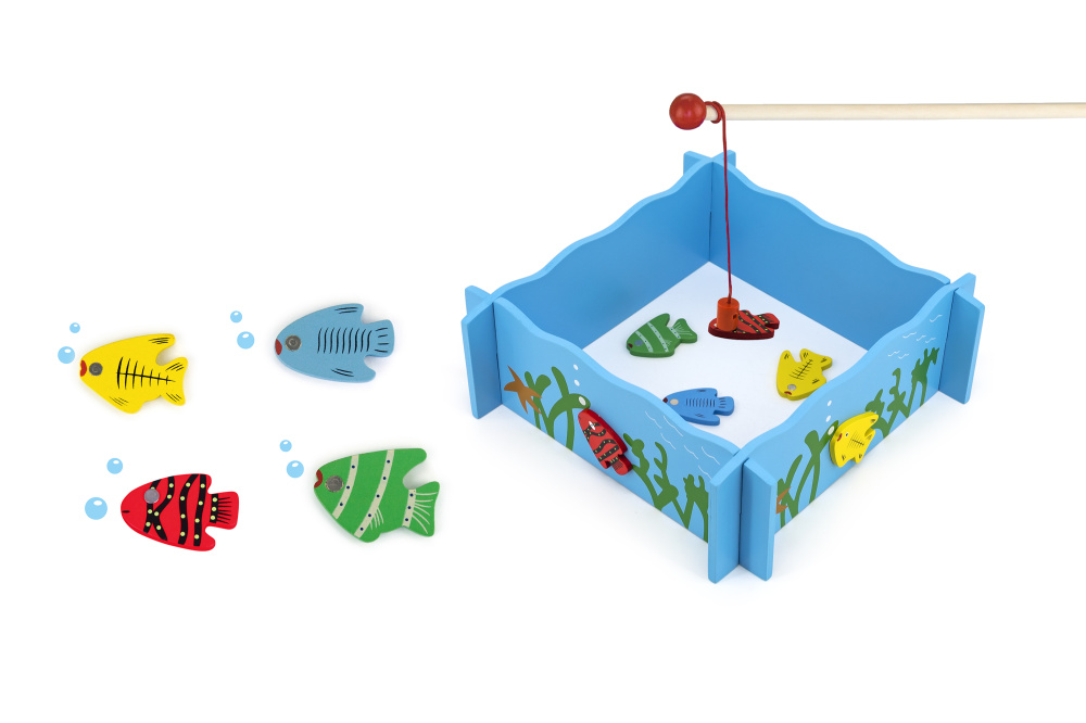 The set includes a fishing pool, 4 magnetic fishing rods and 20 fish with a number on the back.