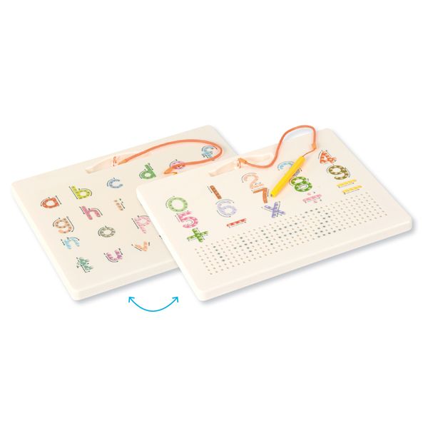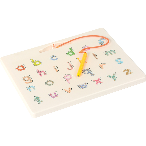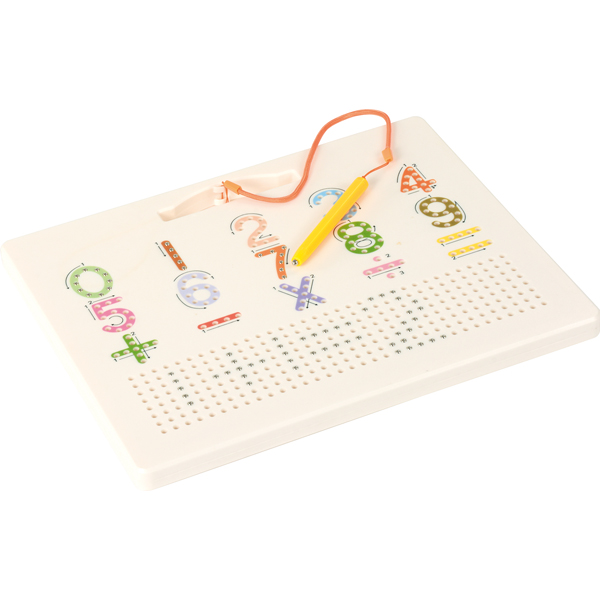 ... Left to right, right to left, top to bottom or the other way around? The printed arrows indicate the direction and order in which the individual letters and numbers are written with the magnetic pen. In the process, the small holes are filled with the steel balls inside. The flat side of the pen can be used to erase the visual check: the balls disappear into the double-sided board. The board with arithmetic operations also includes a blank area for practising.