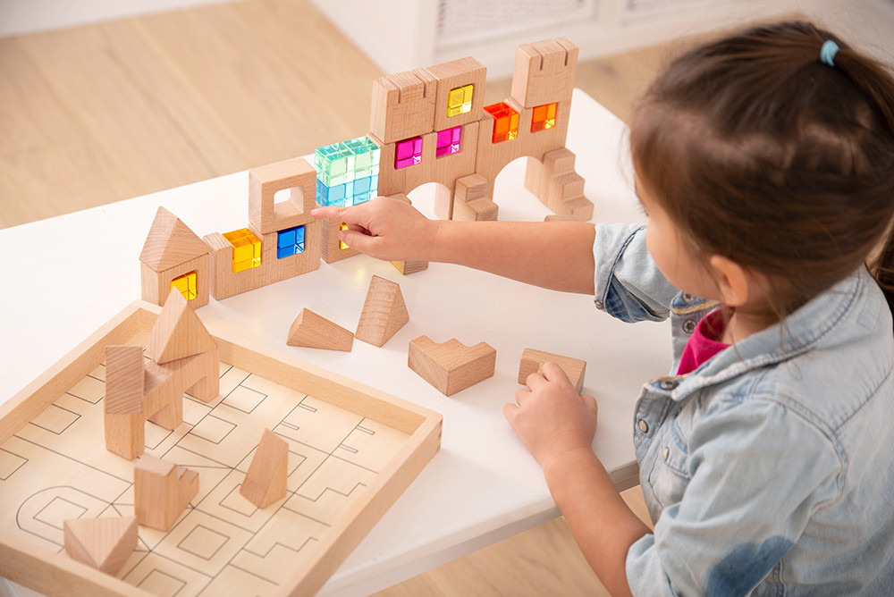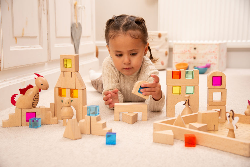 The blocks are carefully designed to be open-ended and varied in style, to encourage creative construction for older children or as a simple stacking and balancing activity for younger children. The beautiful coloured gem squares are a lovely imaginative play addition (windows, doors or colourful decorations) which is ideal as a prompt for using descriptive language.