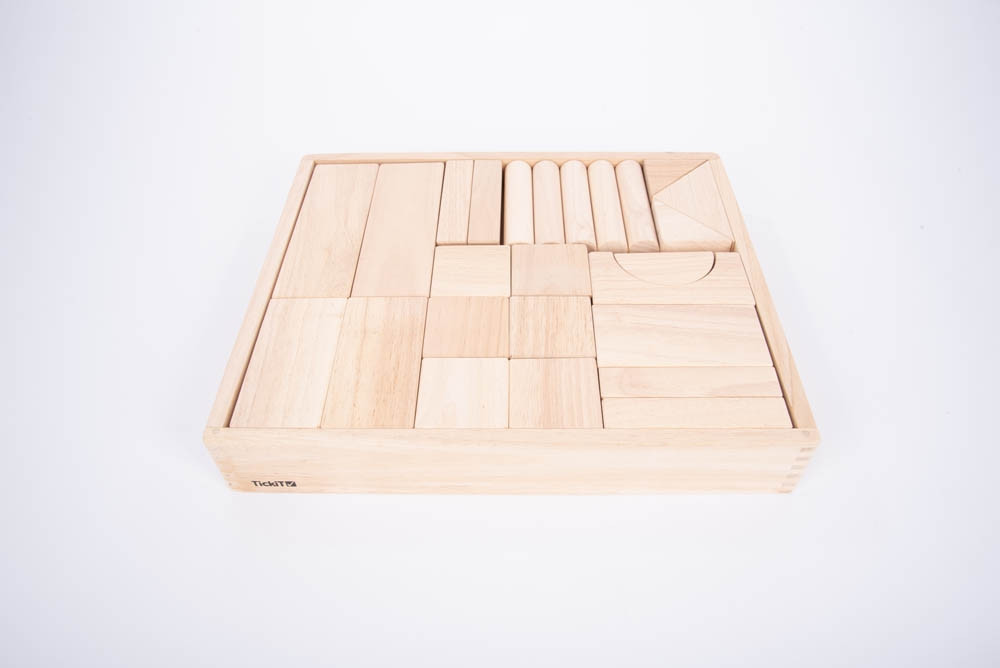 Set includes: 54 wooden blocks supplied in a wooden storage tray.