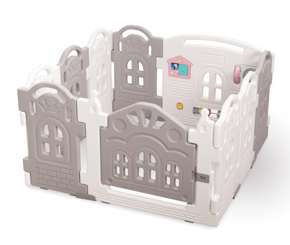 A functional playpen which providesna safe space for one toddler or a smallngroup. Thanks to its openwork design a child can simultaneously play and watch the surroundings. One of the two larger elements is a safe gate with an external protection, the other offers six manual activities. The set has bottom-mountable stabilizers with non-slip material.
