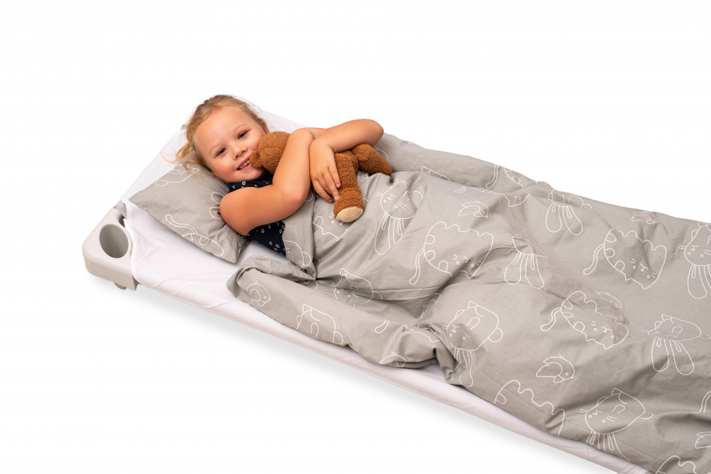 Made of steel tubing and stable colourful plastic elements. The corner parts serving as legs are rounded and have bolts inside inaccessible to children. The fabric is made of non-flammable and non-toxic material. Thanks to its mesh structure it is airy, easy to clean, and its tension can be easily adjusted even after long use. For easy transportation, the beds should be stacked on a dedicated cart (NS0758).