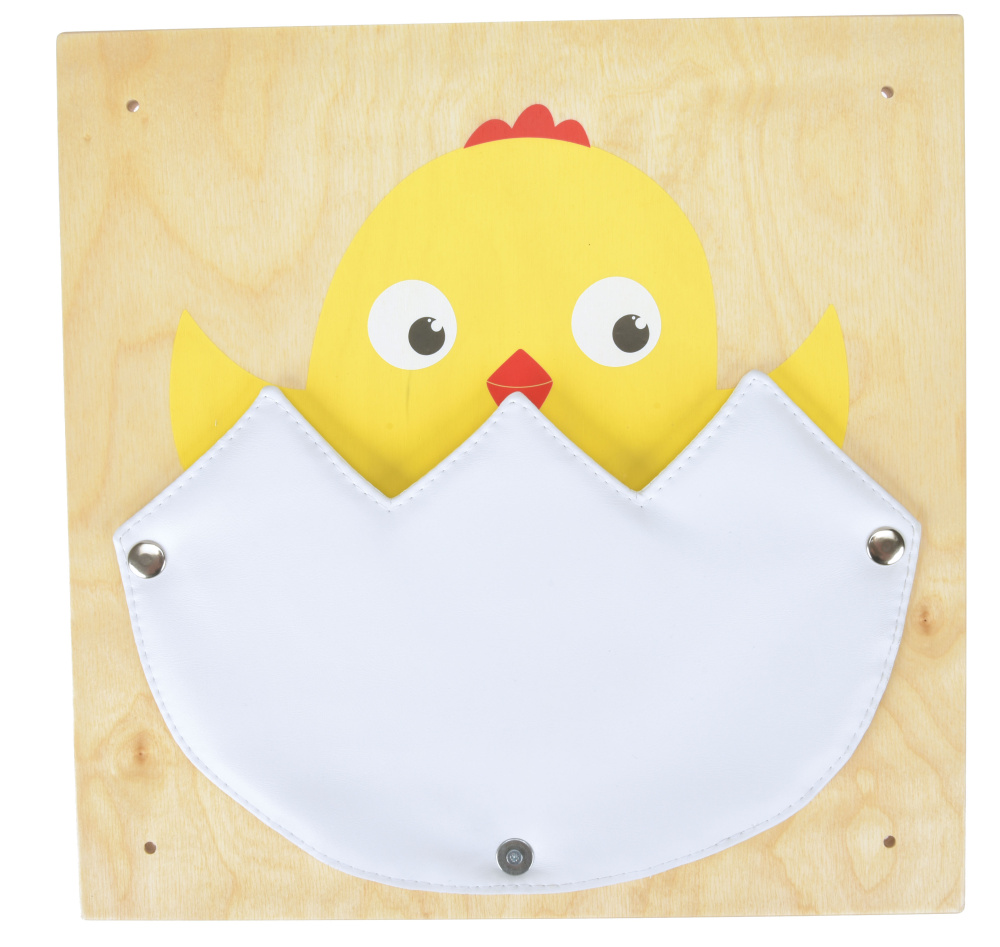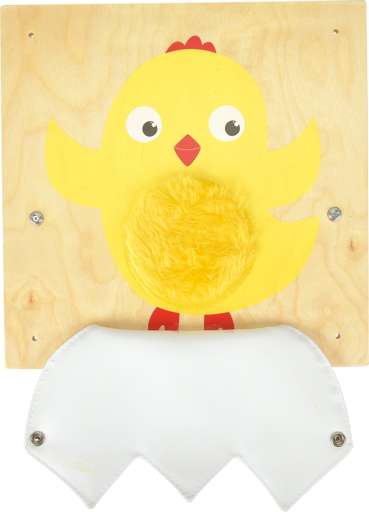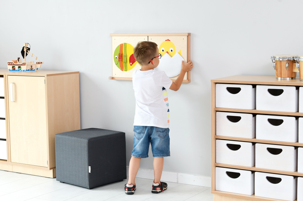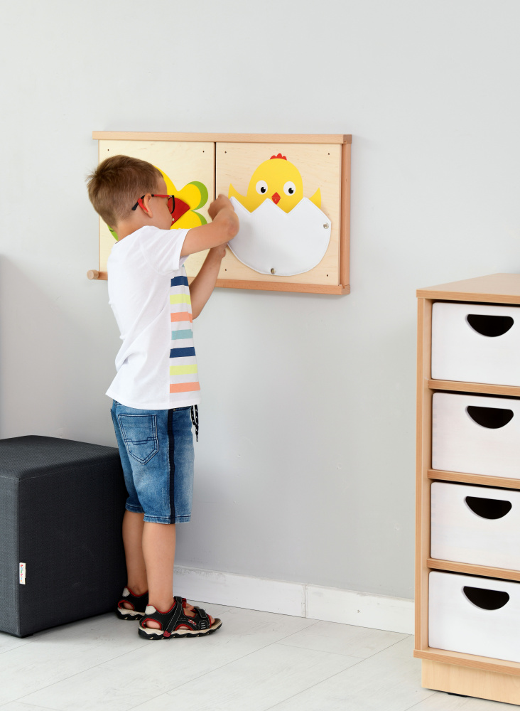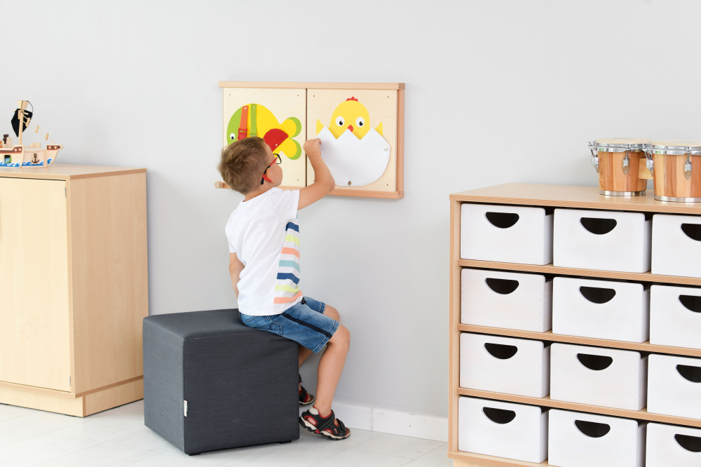 Manipulative-sensory wall panel made of plywood with various motifs encourages children to play, observe and experience by involving touch!