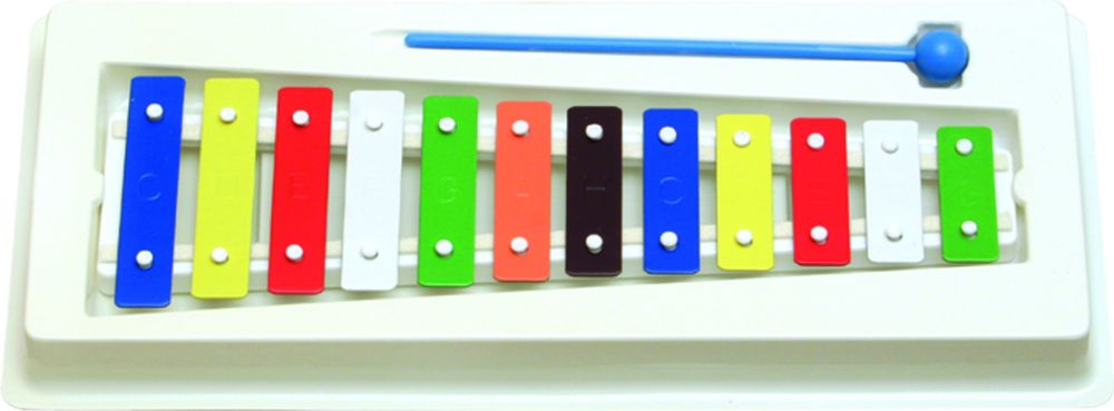 12 coloured sound plates, diatonic, c3 – g4, frame in plastic, with 1 plastic beater and song book, in coloured retail box