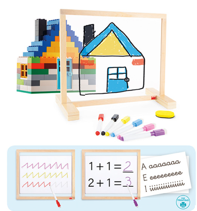 A creative window to draw and recreate the world! Includes 6 erasable coloured felt pens to let your imagination fly. It also facilitates working on pre-writing with the completion of basic concepts sheets (sheets not included). You can use it both vertically and flat on the table. Inspired by Montessori methodology.