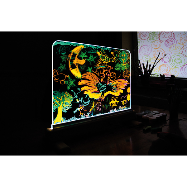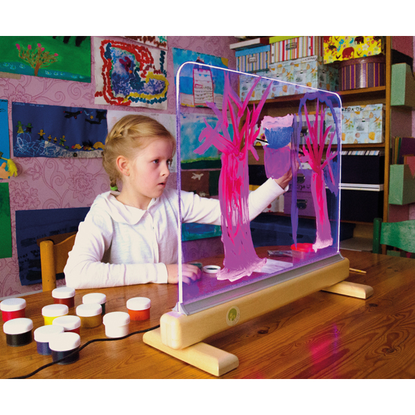 ... the high-quality luminous easel made of special glass is a fascinating medium for painting with finger colours, gouache, watercolour and light pens. It can be painted from both sides from two children and thus invites to experiment. In the foot made of lacquered solid wood there’s an integrated LED light strip that makes the artwork blazing. In addition to white light there are 15 more colours and 4 colour-changing modes possible – the painting optical appears differently in every luminous colour. For cleaning it easier the glass pane can be removed from the wooden pedestal. The corners of the glass pane and the wooden elements are shapely rounded. Incl. remote control, instruction manual/assembly instructions. Is delivered fragmented (2 stand feet must be fixed with two enclosed Allen screws). Performance: 14.4 watt (power plug with transformer). Weight: 4 kg.