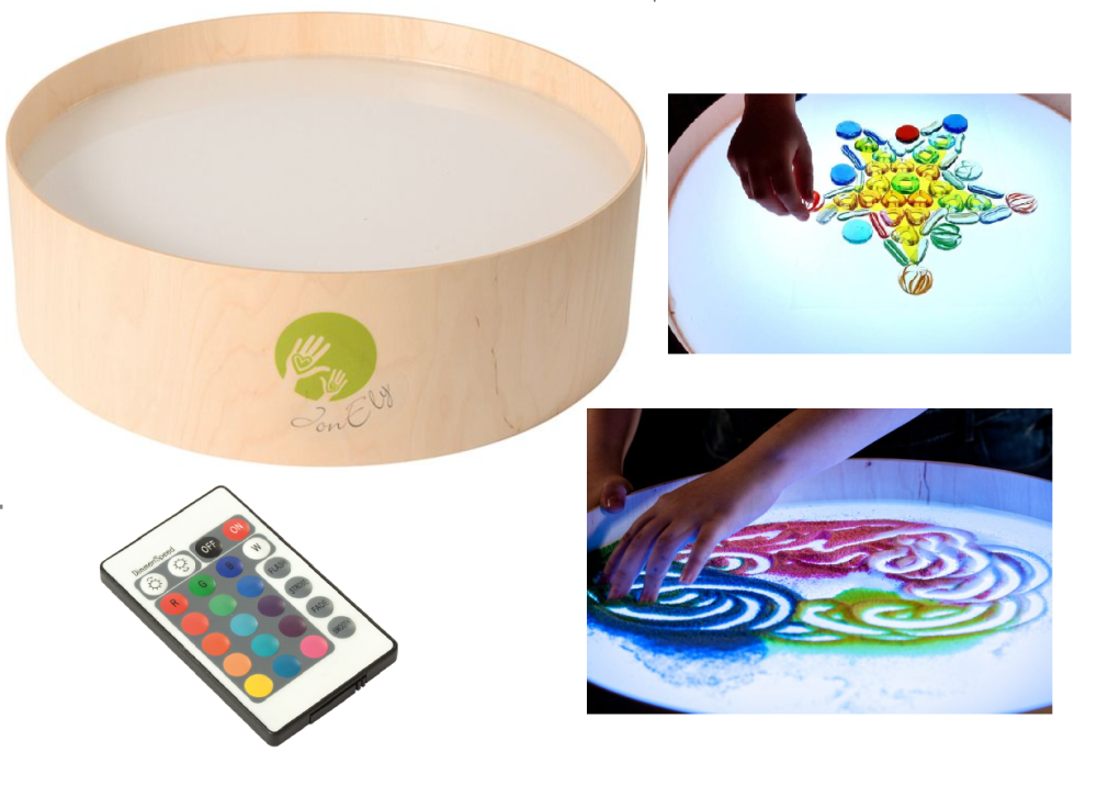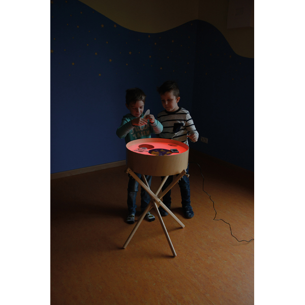 ... Thanks to the luminous pail children can occupy themselves with painting in sand in a quiet and relaxing way – not only in the dark season: By placing all sorts of moulds and translucent playthings on the pool of light, which keeps changing its colour, fantastic images are created. It’s the perfect atmosphere for telling exciting stories. With musical accompaniment this becomes an unforgettable experience. Moreover, painting in sand with fingers, brushes and palette knives promotes fine motor skills as well as the powers of concentration. The edge all around the pail ensures that everything remains on the illuminated area. The luminous pail can also be used as a night lamp or for relaxation. By means of the remote control enclosed the brightness level, individual colours and the automatic colour change can easily be adjusted. The luminous pail is simply connected to a socket with the power cable, which is 180 cm long, and is equipped with a safe 12-volt transformer. Energy-saving LED light. Power: 14.4 watt.
