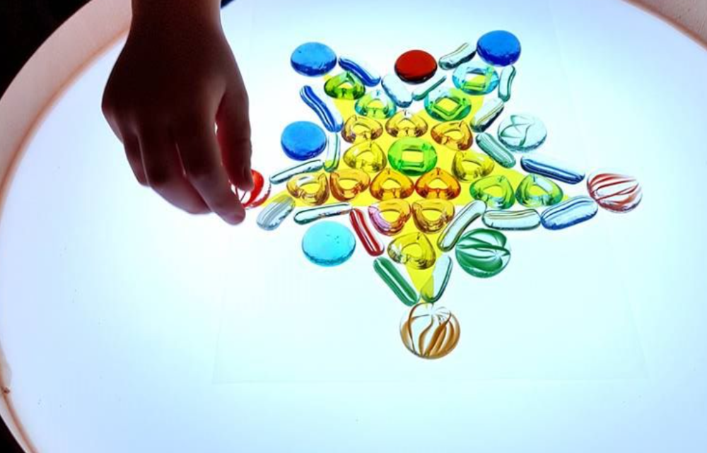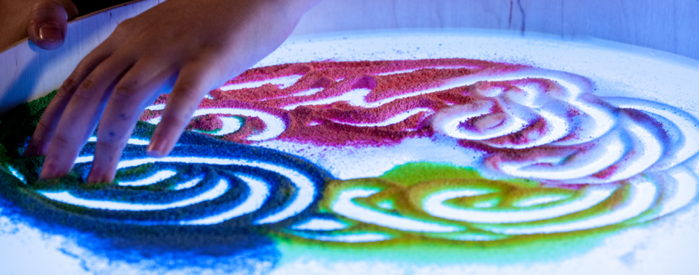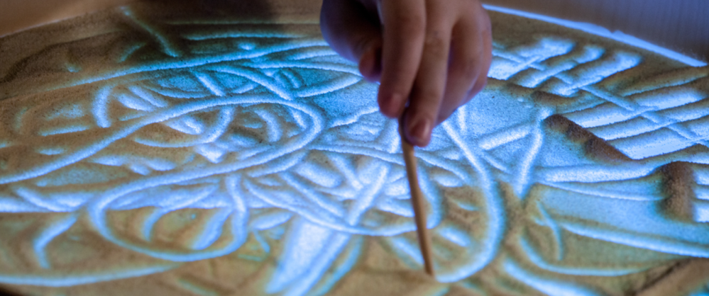 Painting in sand - a fascinating experience! Telling stories, Promoting fine motor skills, experimenting with light and shadow. Tip: Instead of sand you can also use rice or millet on the luminous pail.