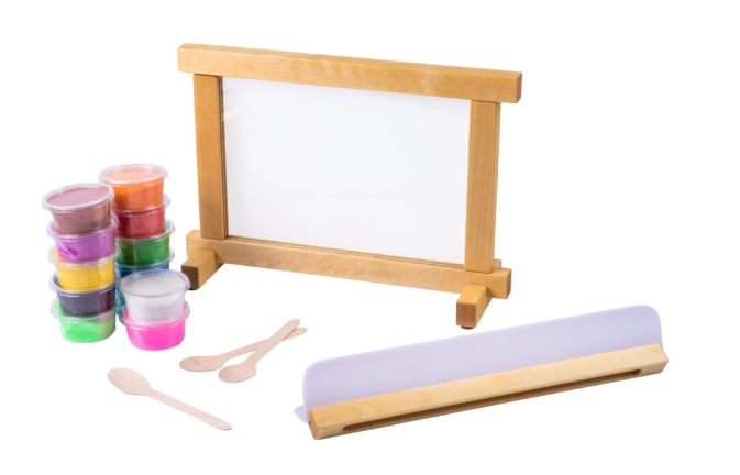 For easy filling into the double-sided plexiglass frame, a long, funnel-shaped attachment is inserted at the top. This is replaced by a closed wooden frame element as soon as the motif is finished. From the outside the plexiglass panels can be written on using whiteboard markers or designed with stickers. Due to the massive wooden feet the sand picture stands stable. The frame can be refilled again and again - also in combination with other materials such as buckwheat, poppy seeds, semolina, rice, corn, lentils, small noodles,... coloured salt. Content: Frame with filling aid and 12 x 100g of coloured sand.