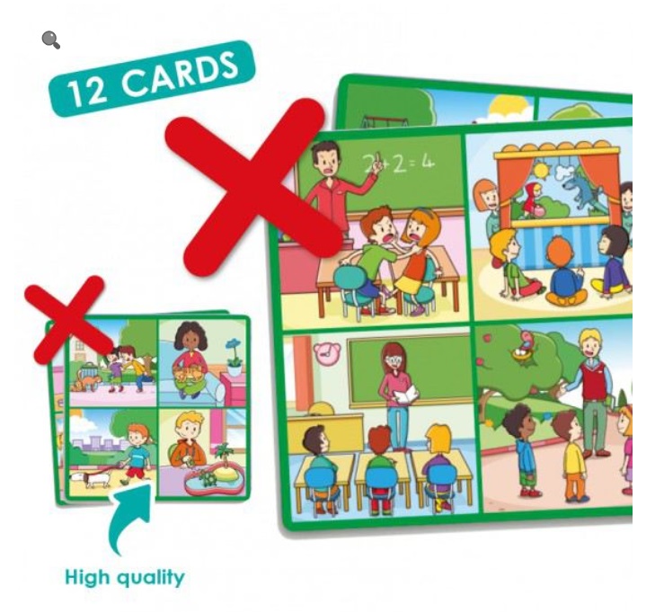 The game includes 12 cards (with 4 pictures on each) and 12 red crosses to mark the wrong one. There is a self-check option on the back of the cards