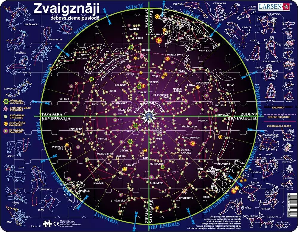 - This illustrative map puzzle of constellations demonstrates 25 of the brightest and closest stars, the red giants and the super giants - all from the Northern Hemisphere. You'll find the zodiac signs and the twelve months of the year. In addition to this, winter and summer solstice falls vertically down the middle, and the spring and fall equinox are divided from left to right across the centre. This detailed puzzle comes complete with 70 traditional style puzzle pieces, and all the names of the constellations marked in the puzzle, are named after something in greek mythologies. The black circle pictured amid the puzzle shows the dark starry sky. This puzzle is not only best suited for older children, but adults alike with a keen interest in stars will find it most fascinating and enlightening.