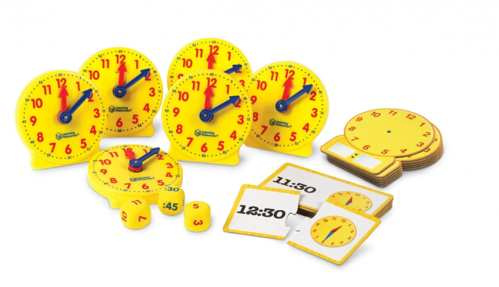 - Set includes six geared plastic clocks, six write-and wipe clocks, 24 double-sided cards, three durable foam dice, and Activity Guide.