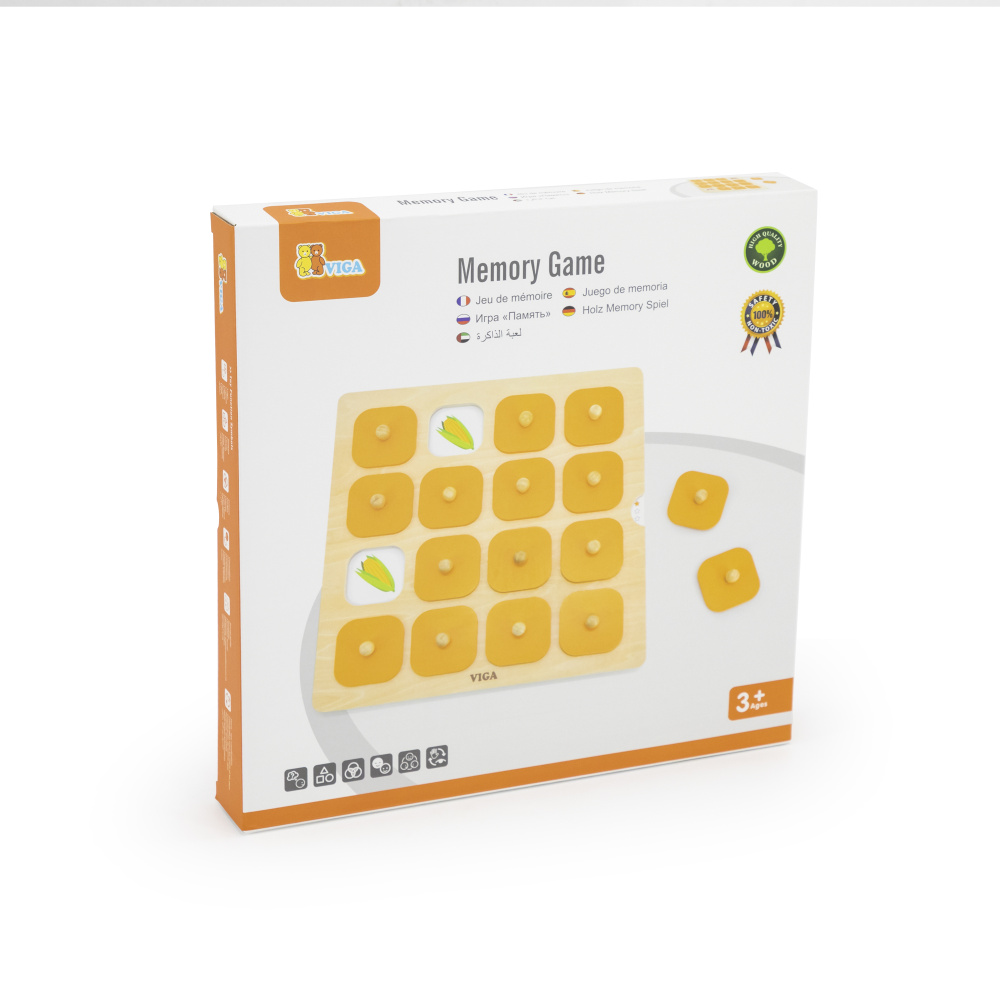 Šī klasiskā atmiņas spēle ir aprīkota ar izturīgu koka kasti, 16 koka vākiem un 5 divpusējām spēļu kārtīm.