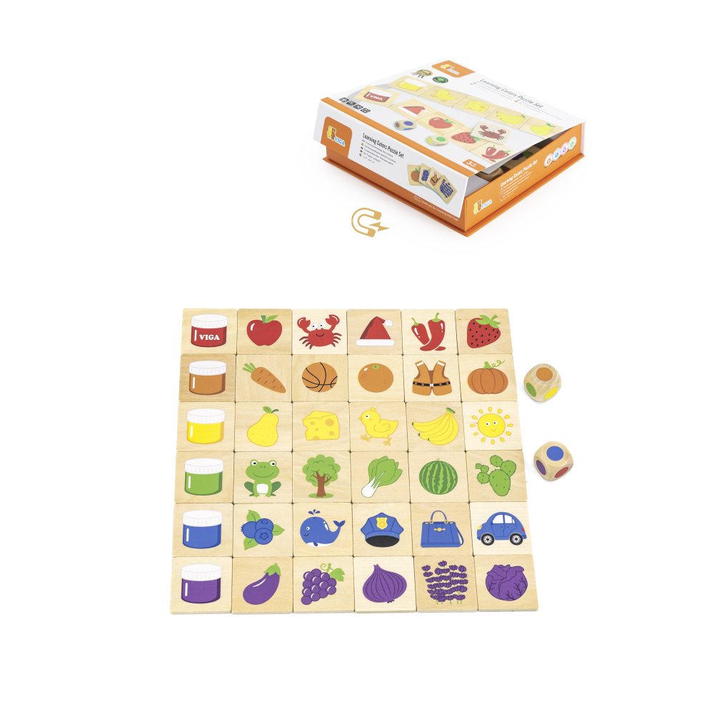 Mācību krāsu puzļu komplektā ir 36 koka klucīši 6 krāsās, un katrā krāsā ir 6 klucīši. Iekļauts ir kauliņš.