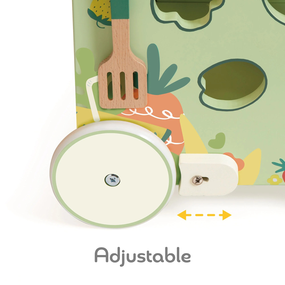 Tas ir aprīkots ar daudziem virtuves piederumiem, tostarp izlietni, plīti un traukiem, lai pagatavotu savu iecienīto ēdienu. Tas ir arī lielisks, izturīgs staigulītis, kas palīdzēs jūsu mazajam spert pirmos soļus.