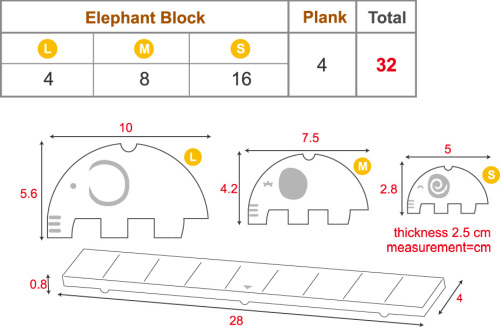 Komplektā: 32 elementi (4 x dēlis, 4 x zilonis liels, 8 x zilonis vidējs, 16 x zilonis mazs).