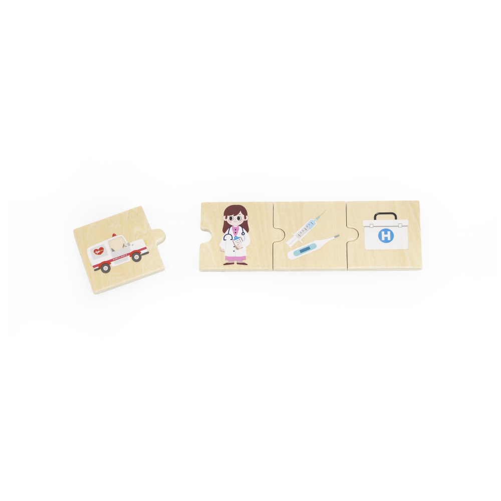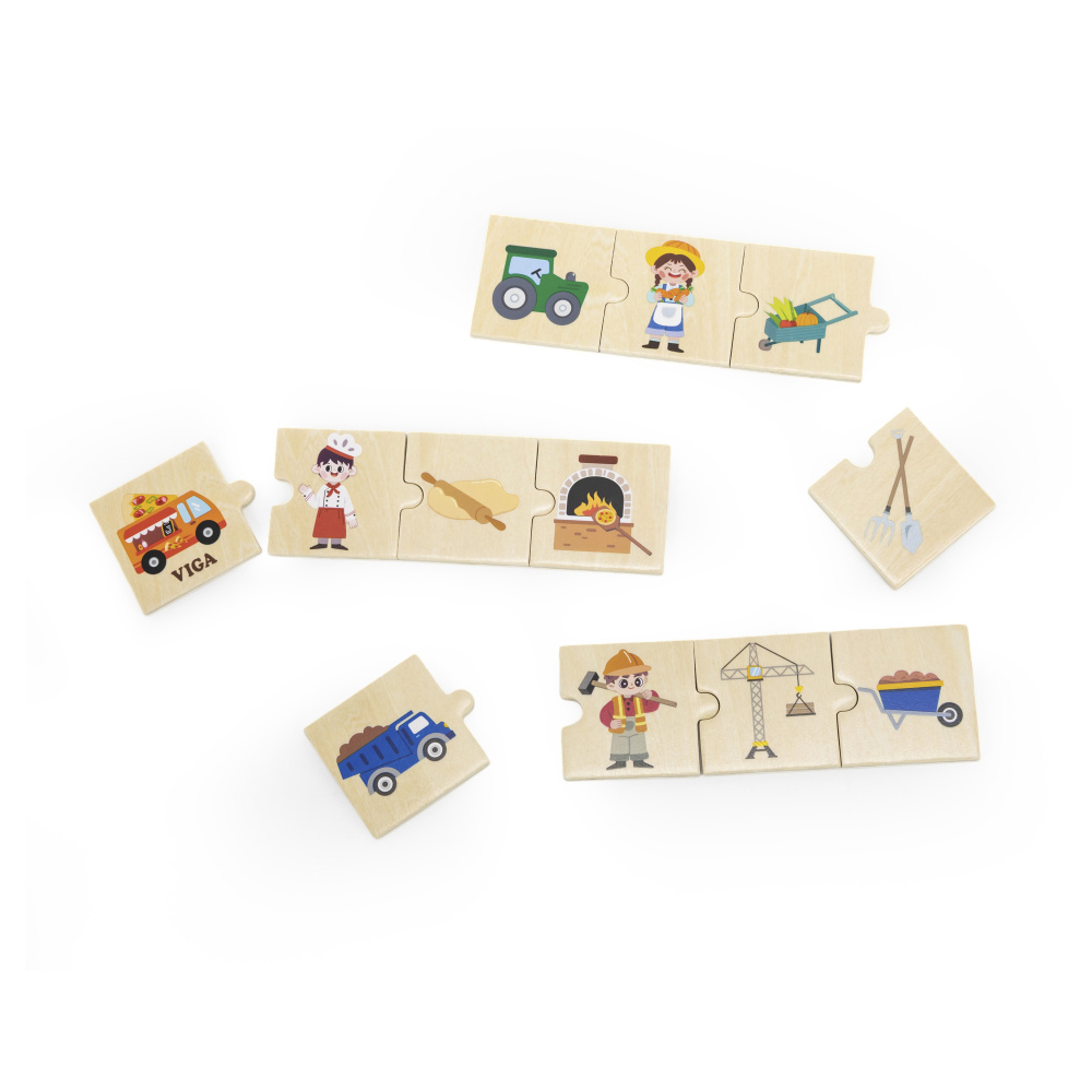 Jauns puzļu komplekts ir izstrādāts, lai uzlabotu bērnu atmiņu, analīzes spējas un kritiskās domāšanas prasmes. Viss komplekts satur 24 koka puzles gabaliņus. Palīdziet bērniem izpētīt 6 dažādas profesijas, to darbarīkus un transportlīdzekļus, kā arī attīstīt loģisko spriešanu un stāstīšanas prasmes.