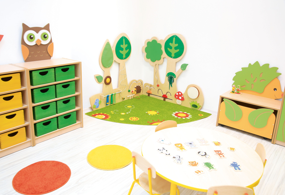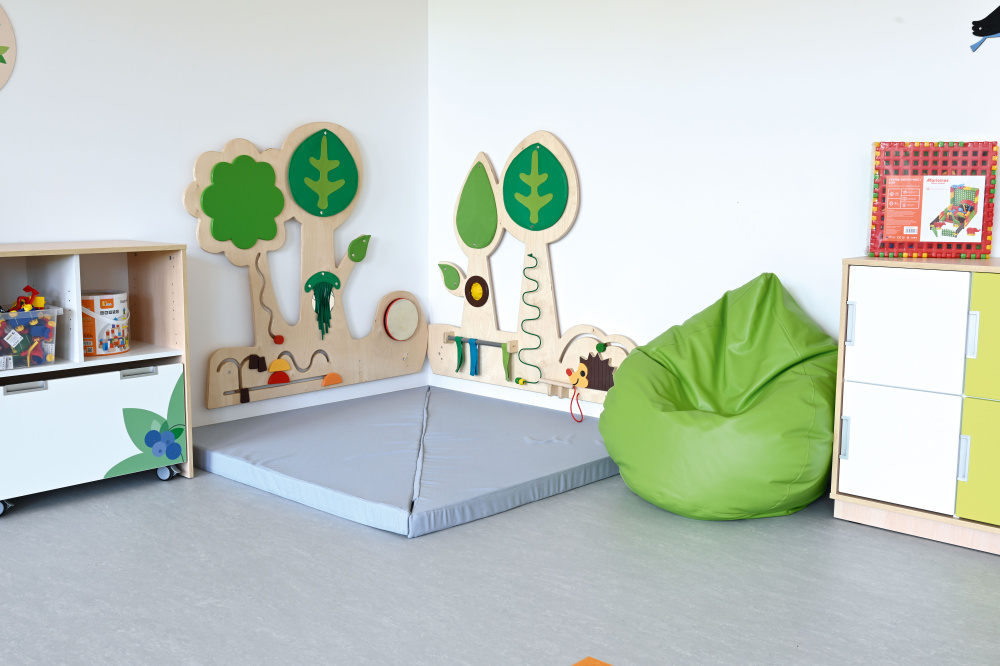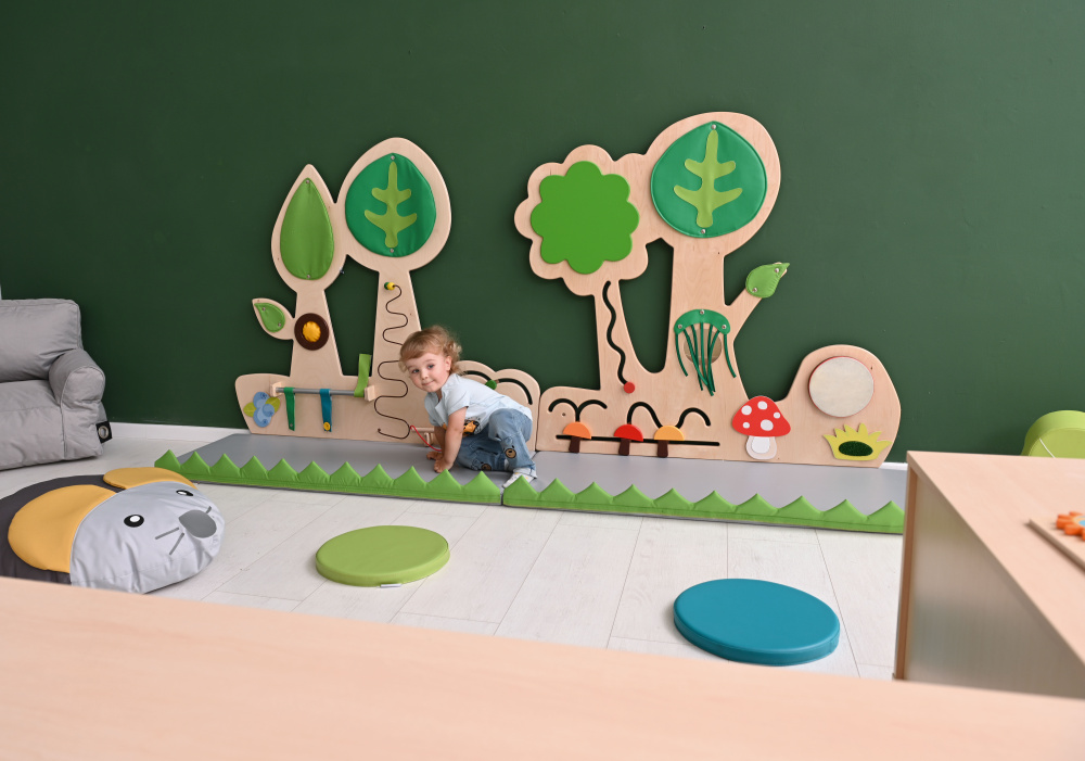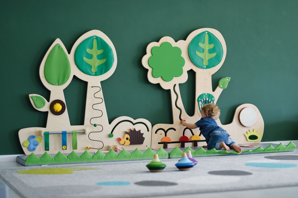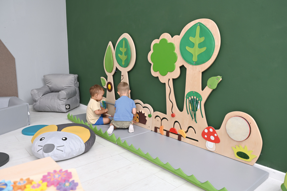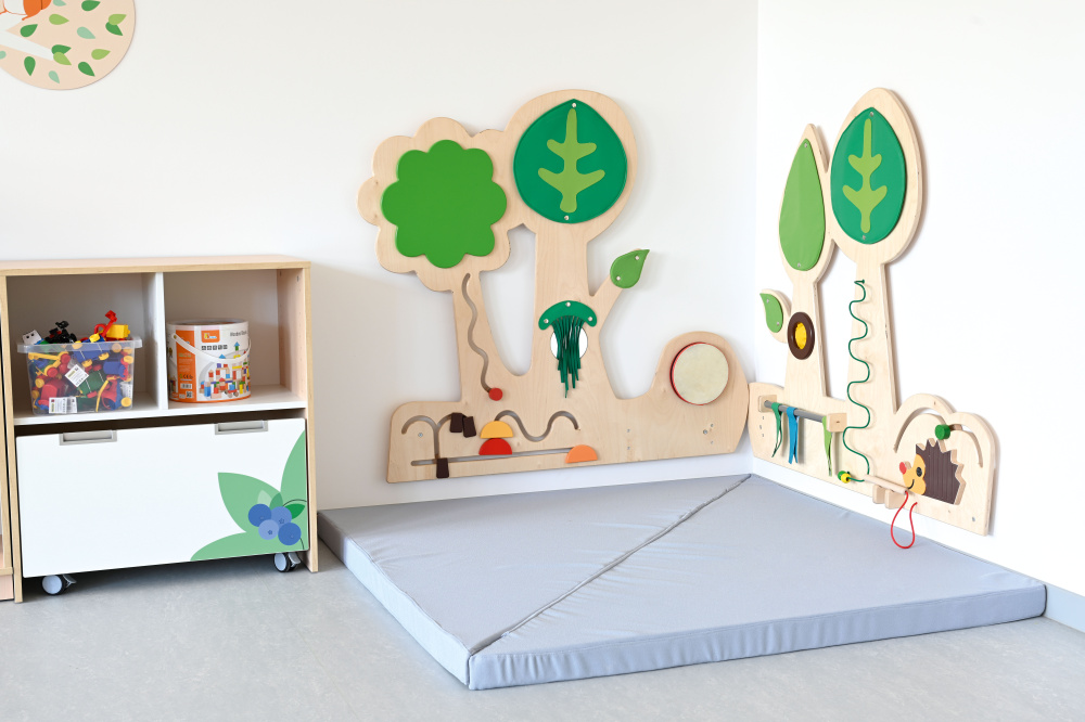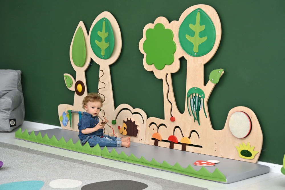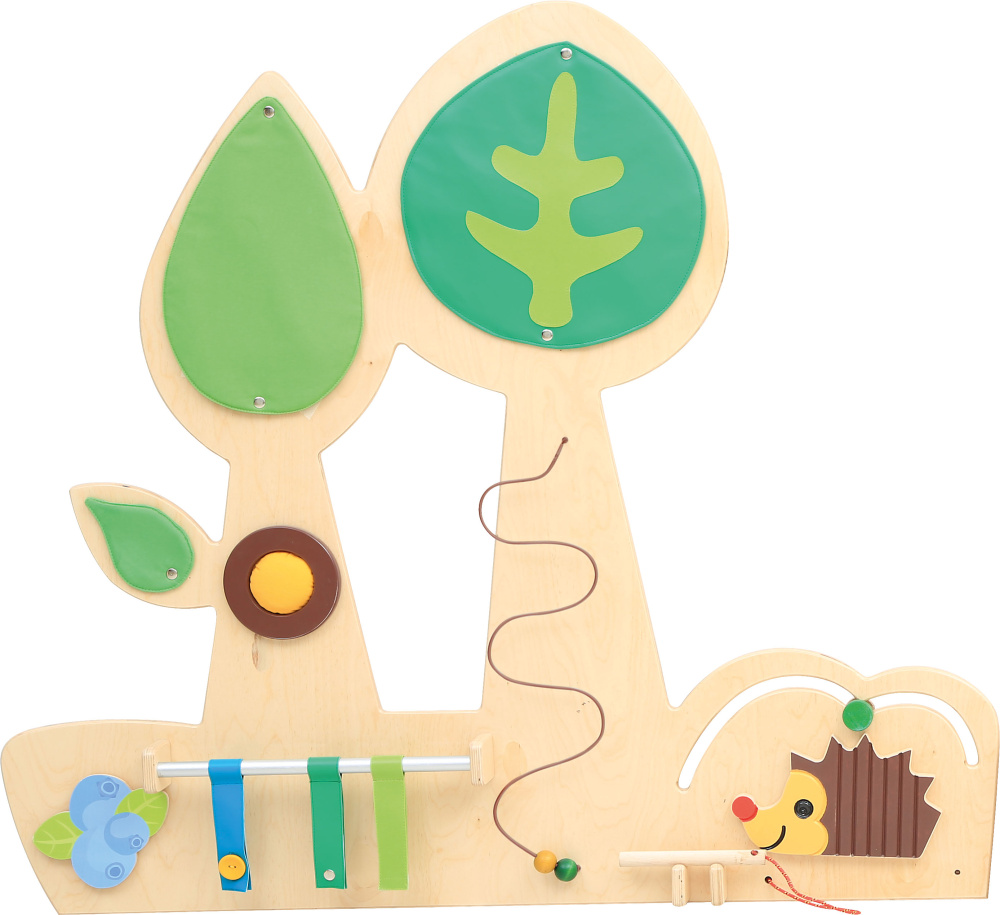 Manipulatīva siena no lakota saplākšņa, ar sensorām aplikācijām, labirintiem un koku zariem no dažādu faktūru auduma. Tie palīdz attīstīt pieskārienu, roku veiklību, roku-acu koordināciju un motoriku. Bērni var apgūt arī krāsas un formas. Kokā ietilpst labirints, stienis ar dažādu faktūru auduma gabaliņiem, frēzēts ezis ar koka irbulīti, čīkstoša caurule un melleņu aplikācija.