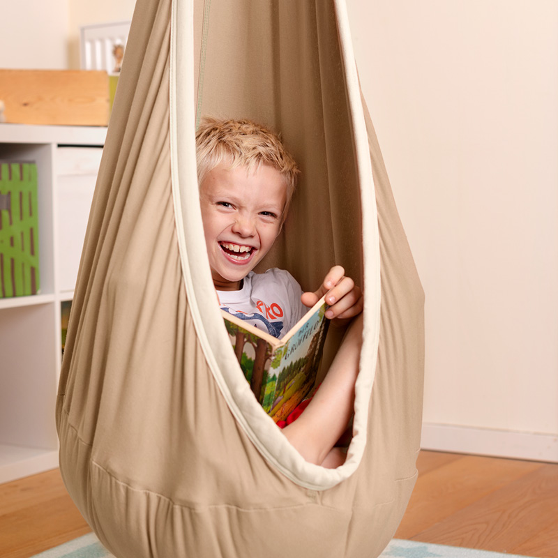 Mājīgā organiskā iekaramā ligzda dod bērniem laiku un vietu sev peldošā oāzē. Šeit jūs varat vienkārši aizvērt priekškaru un uz mirkli pilnībā norobežoties no drudžainās pasaules. Šo lielisko piekaramo var izmantot ne tikai atpūtai un lasīšanai, to var izmantot arī vienkārši tērzēšanai un rotaļām - griezties, šūpoties un spēlēties. Bērniem tā ir miera un relaksācijas vieta, kā arī rotaļu, jautrības un piedzīvojumu vieta!