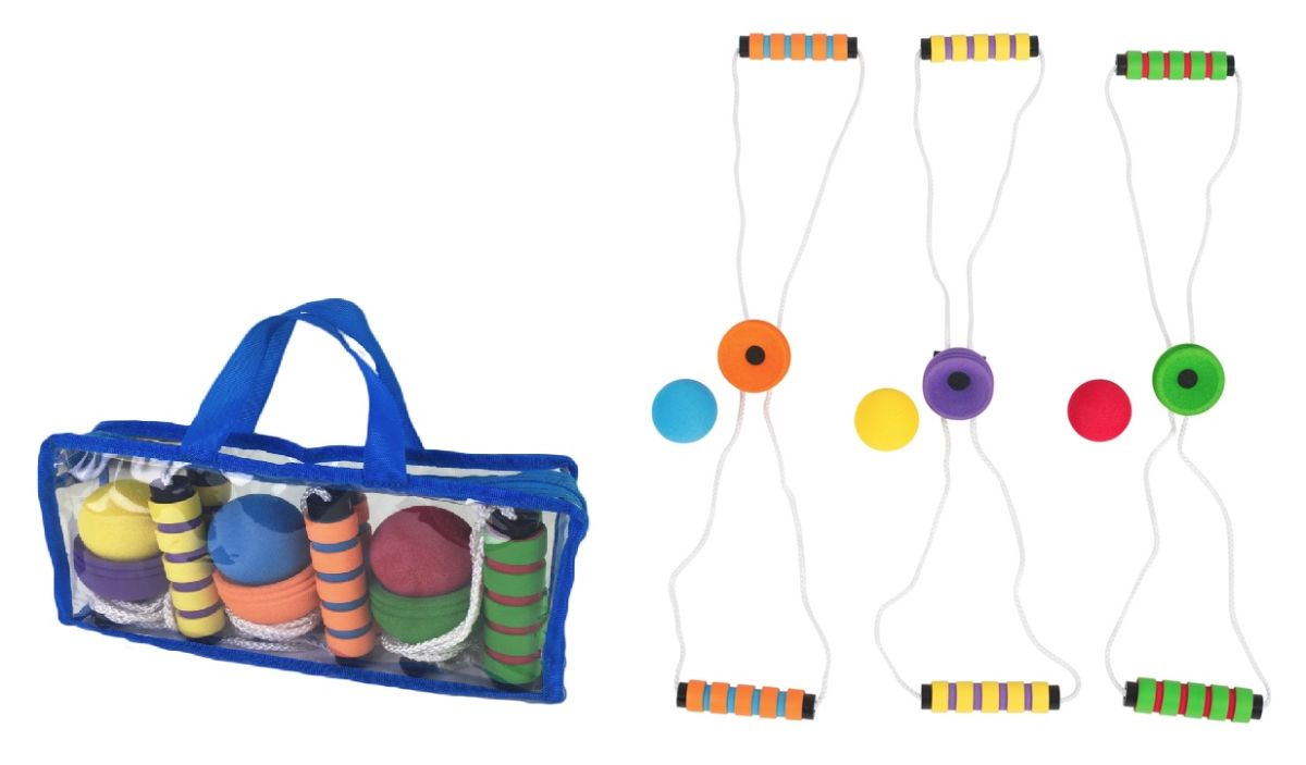 Komplektā ir iekļautas 3 virves ar mīkstiem gumijas rokturiem (garums 83cm), 3 gumijas bumbiņas un uzglabāšanas soma. Spēles elementi ir izgatavoti no kompakta, taču mīksta un elastīga gumijota materiāla.