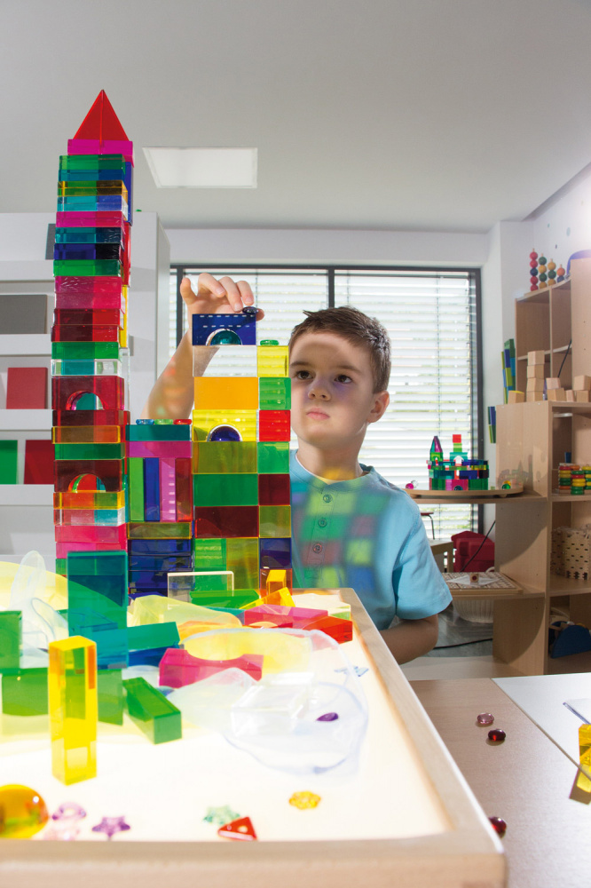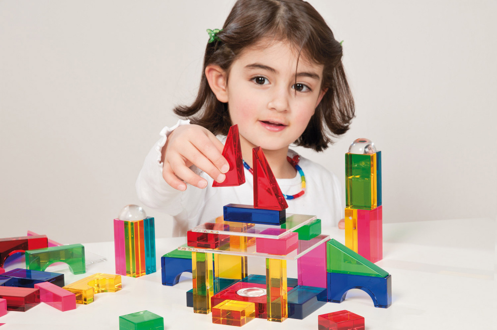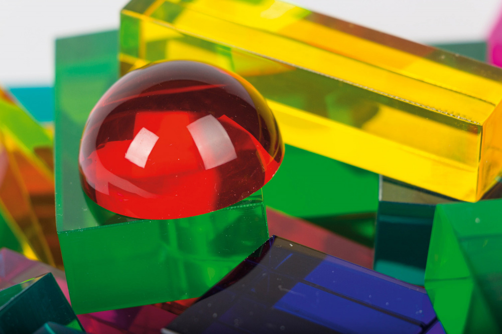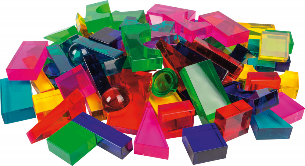 Saturs/Izmēri: kopā 94 detaļas. 80 kubi (kolonnas, tiltu arkas, puslodes, pa diagonāli sadalīti kubi, puskubi, veseli kubi). 14 kristāldzidras plāksnes (10 x 10 cm).