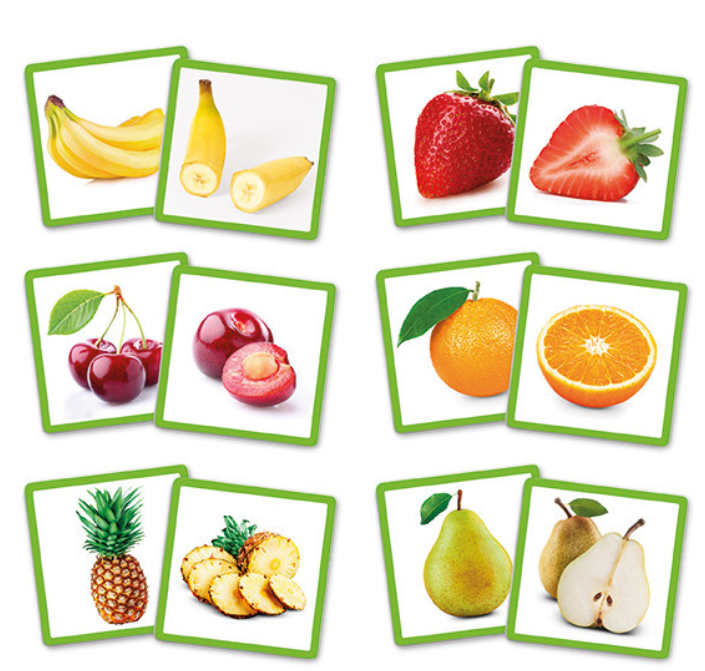 Spēlē ietilpst 12 smaržu trauciņi un 24 augļu kartiņas ( katram auglim 2 kartiņas- augļa ārpuse un iekšpuse).