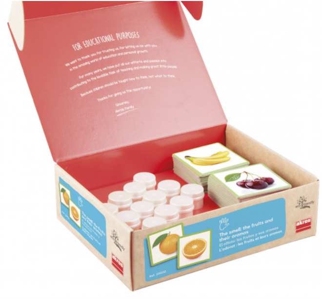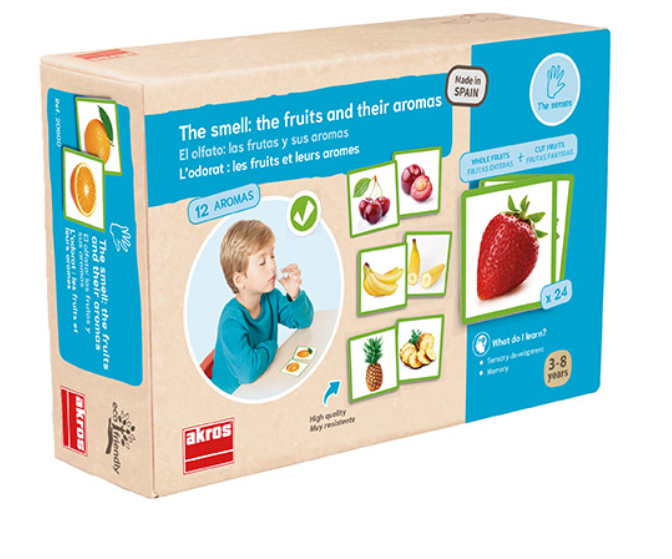 Augļu smaržas: zemene, banāns, persiks, ananāss, apelsīns, ābols, bumbieris, citrons, ķirsis, kokosrieksts, melone, plūme. Šie aromāti ir izteikti un atšķirami cits no cita, tādējādi bērnam veicinot ožas maņu. Savienojot smaržu ar augļu foto kartiņām, bērnam tiek vēl labāk nostiprināta savsatrpējā asociācija.