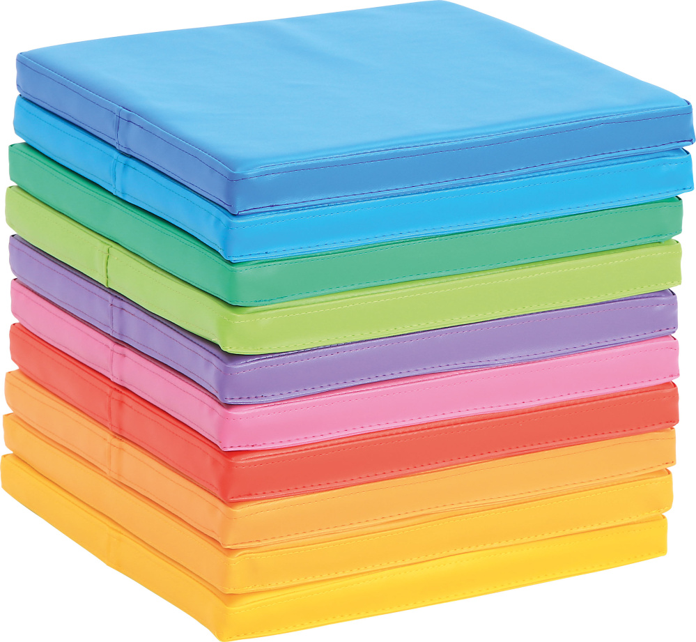10 gab. sēžamu kvadrātu komplekts varavīksnes krāsās, kas kalpo kā krāsaini grīdas sēdekļi!