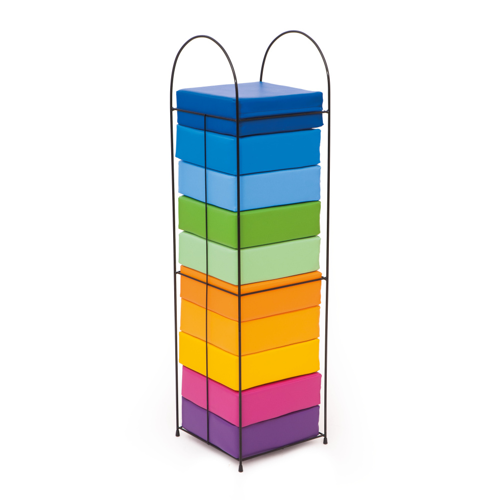 Statīvs izgatavots no metāla ar melnu pulverkrāsojumu un paredzēts 10 kvadrātveida sēžamo pufu uzlabāšanai.
