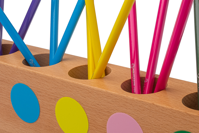Šis zīmuļu turētājs ne tikai izskatās lieliski, bet arī ievieš kārtību ikdienas dzīvē bērnudārzā vai skolā. Garā koka klucītī ir ievietoti desmit apaļi padziļinājumi, kuros ievietot krāsainos zīmuļus. Attiecīgās krāsas ir atzīmētas ar lieliem punktiem klucīša sānos. Tādējādi zīmuļu turētājs kalpo arī kā krāsu šķirošanas spēle mazākiem bērniem. Izvēloties krāsas, mēs rūpīgi rūpējāmies, lai tās būtu krāsas, ko bērni lieto visbiežāk. Ja zīmuļi pēc katras lietošanas reizes tiek ievietoti atpakaļ pareizajā padziļinājumā, tos var atrast uzreiz un tie nenoripo no galda.