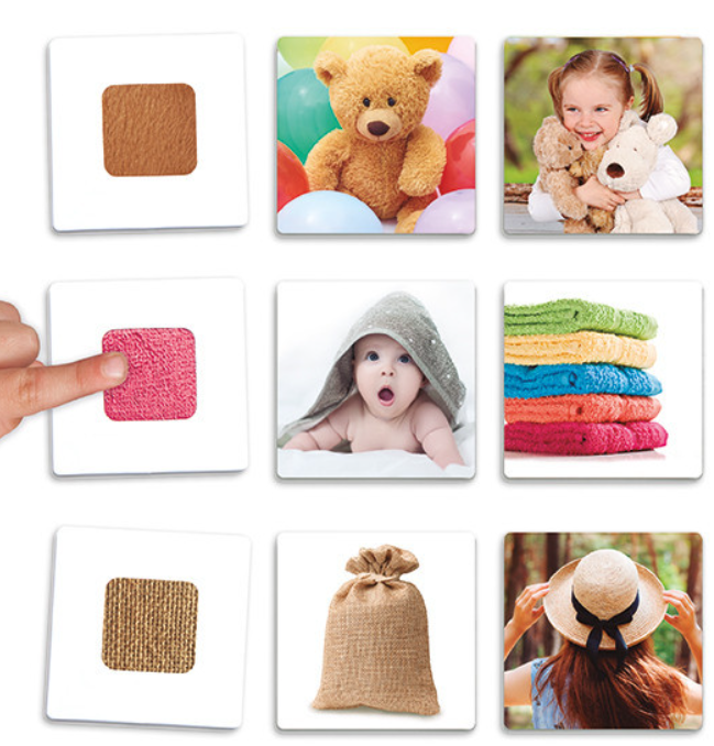 Lai palīdzētu bērniem sastādīt pareizu asociāciju starp tekstūras kartītēm un kartītēm-fotogrāfijām, kartiņu otrajā pusē ir paškontroles sistēma: