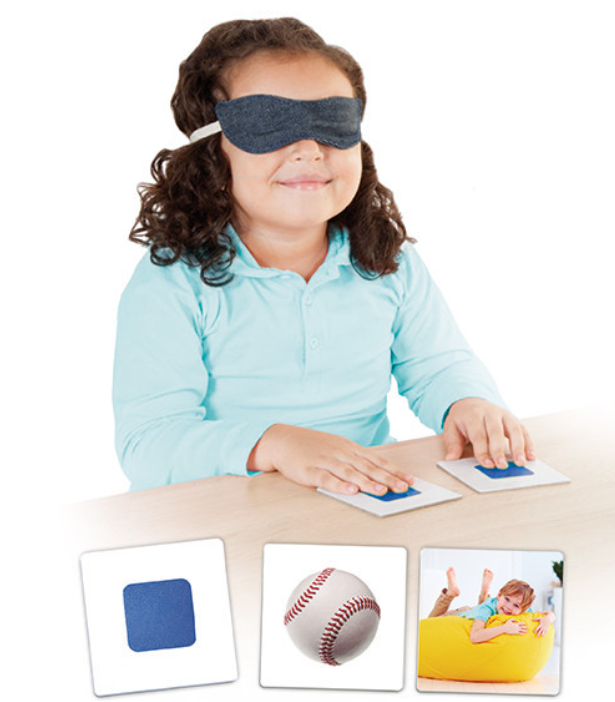 Acu aizsegs (brilles) paredzēts darbam ar taustes atmiņas attīstīšanu (caur tekstūras kartiņu vingrinājumiem). Tādēļ, ka komplektā ir ieklautas divas kartiņas no katras tekstūras, un 2 acu aizsega pāri, divi bērni var vienlaicīgi strādat ar uzdevumiem.