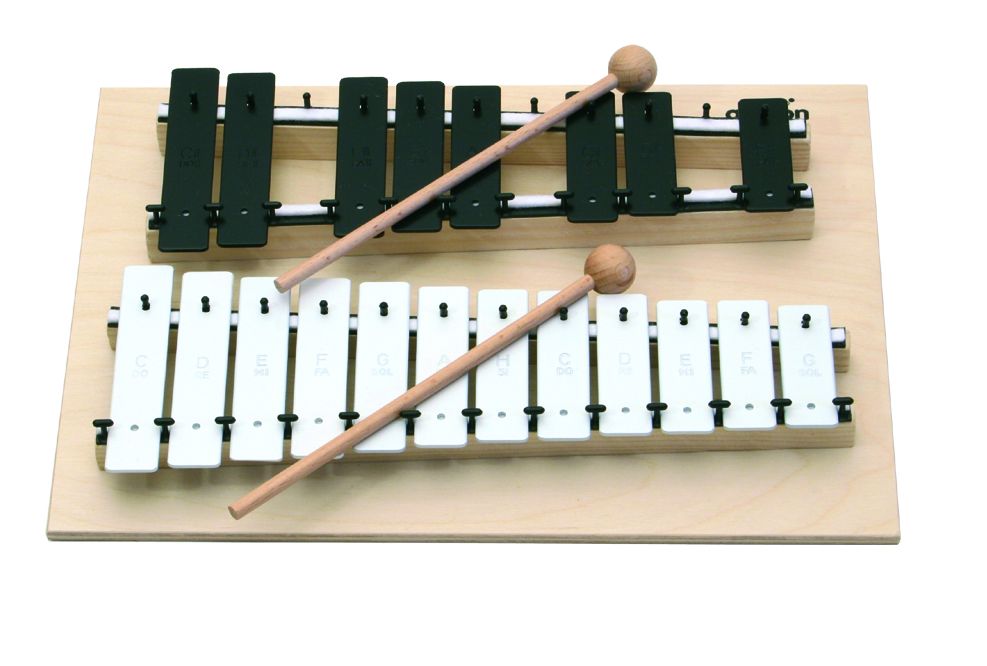 Metalofons uz koka pamatnes ar balti / melniem metāla taustiņiem .