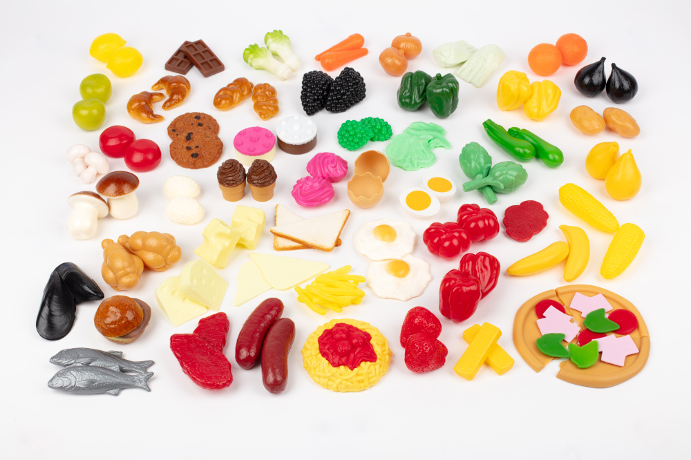 114 ļoti reālistisku 100% pārstrādājamu plastmasas pārtikas produktu kolekcija.