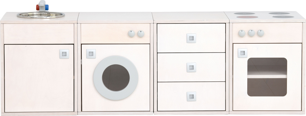 Moduļi, kas imitē virtuves skapjus no balināta saplākšņa (18mm biezs).