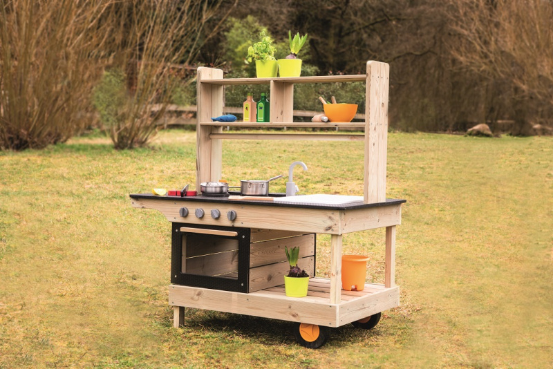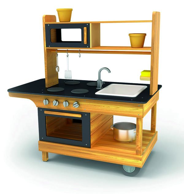 - Āra virtuve nodrošinās stundām ilgi jautras lomu spēles bērniem un padarīs viņus par gardēžu pavāriem. Ēdienu var pagatavot uz četrām plīts plāksnēm un cept cepeškrāsnī. Masīvā virtuve ir izgatavota no augstas kvalitātes un laikapstākļiem izturīga koka. Tā ir droša, pateicoties izturīgajai konstrukcijai. Virtuves dabīgais un mūsdienīgais dizains iederas katrā bērnudārzā. Plašās darba telpas ir lieliski piemērotas grupu rotaļām, un virtuve ir pieejama no visām pusēm. Visas virtuves virsmas var noslaucīt un ir viegli tīrāmas. To var viegli pārvietot uz dažādām vietām iekštelpās vai ārā