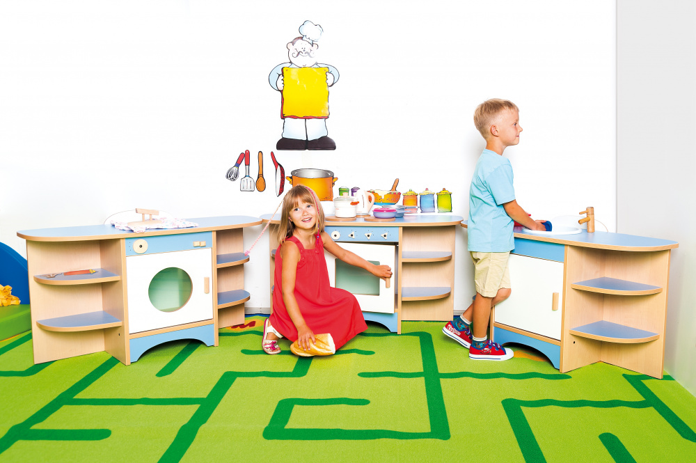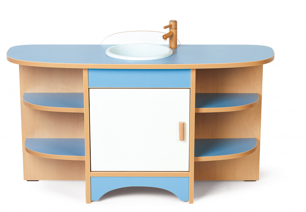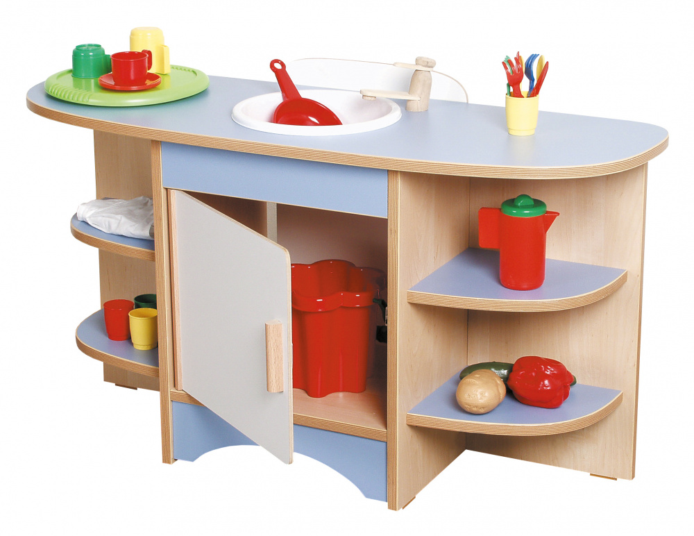 Bērnu rotaļu virtuves plaukts sastāv no koka skapīša ar zilu virsmu, kurā iestrādāta plastmasas izlietne, vaļēji plaukti un durvju skapis gružu spainim. Izmērs: 104 x 37 x 56 cm..