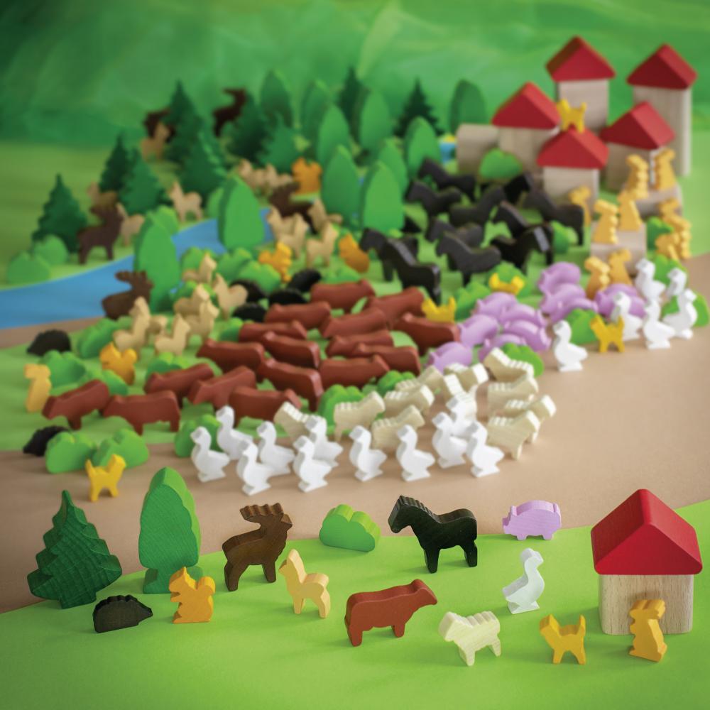 12 mājas, 6 jumti, 12 skuju koki, 12 lapu koki, 6 brieži, 18 stirnas, 18 govis, 12 zirgi, 12 cūkas, 12 aitas, 6 kaķi, 12 truši, 18 zosis, 8 eži, 6 vāveres