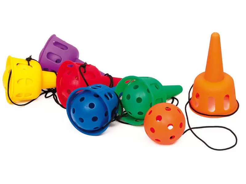 Bumbiņa ir piestiprināta pie kausa ar auklu.