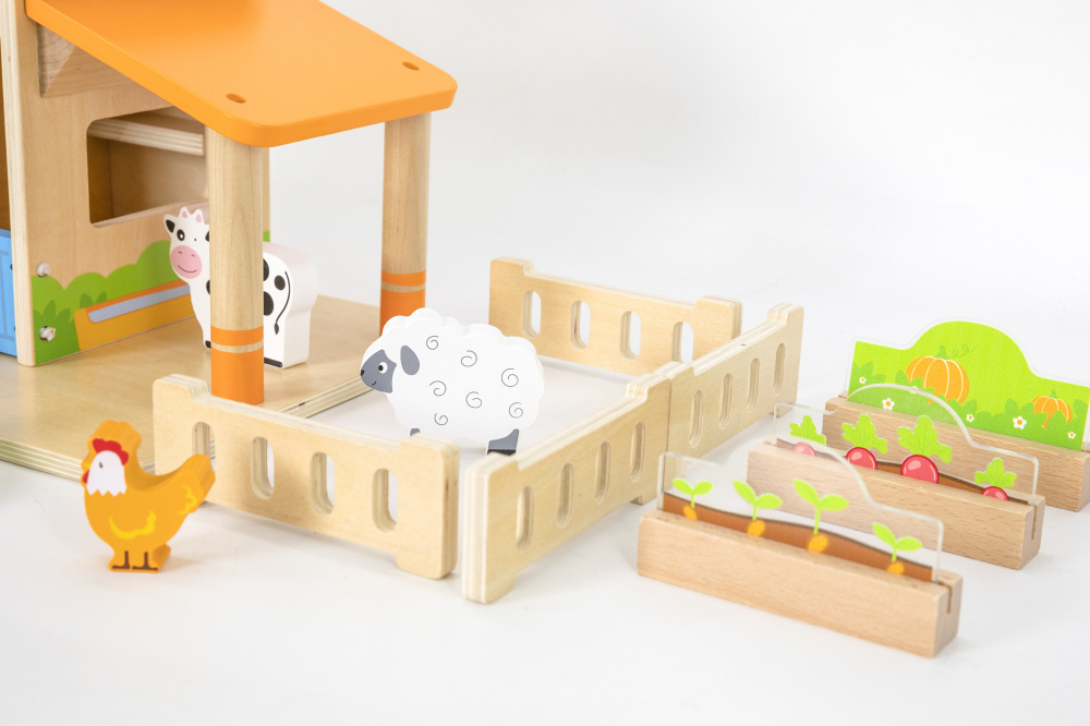 Atdzīvini lauku ainavu ar koka lauku rotaļu komplektu! Šajā burvīgajā koka komplektā ietilpst lauku māja, dzīvnieki, fermeris, traktors, labība un žogi — ideāli piemēroti lomu spēlēm un mācībām.