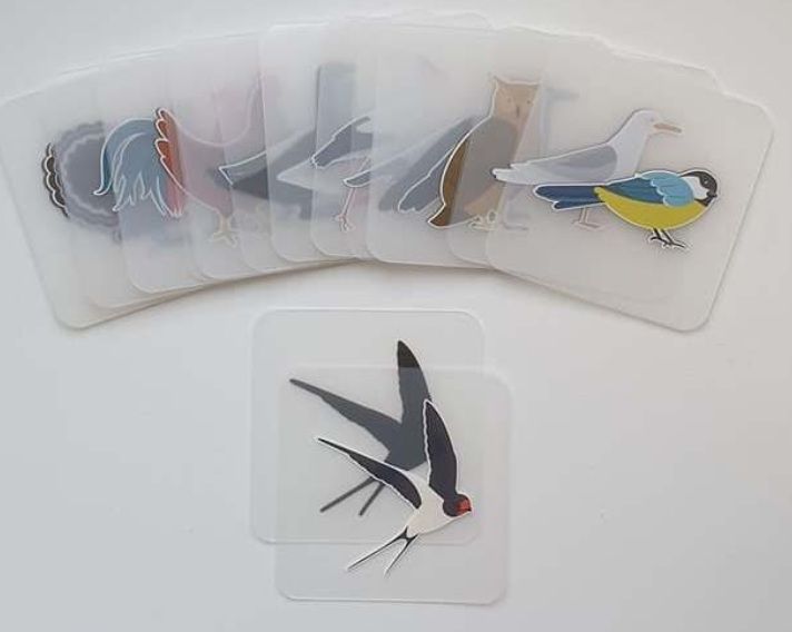 Komplektā 24 kartītes - 12 Latvijā mītošu putnu bildes un 12 to ēnu kartītes.