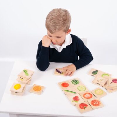 Kvalitatīvi un reālistiski dārzeņu attēli uzdrukāti uz koka klucīšiem. Klucīši ir gludi un ērti paņemt bērna rociņai.