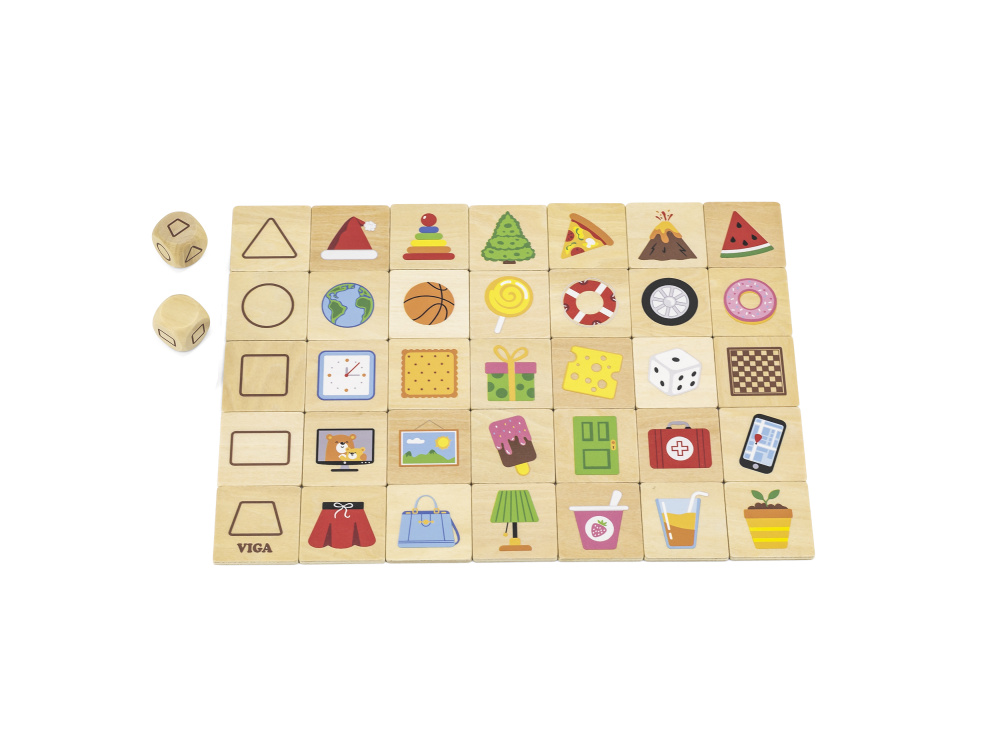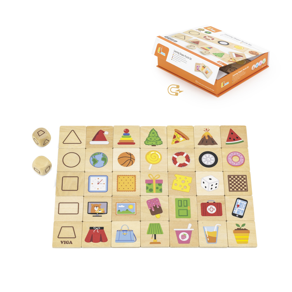 Набор для изучения геометрических фигур содержит 35 деревянных блоков 5 различных форм, по 7 блоков на каждую форму. В комплект также входит игральная кость.