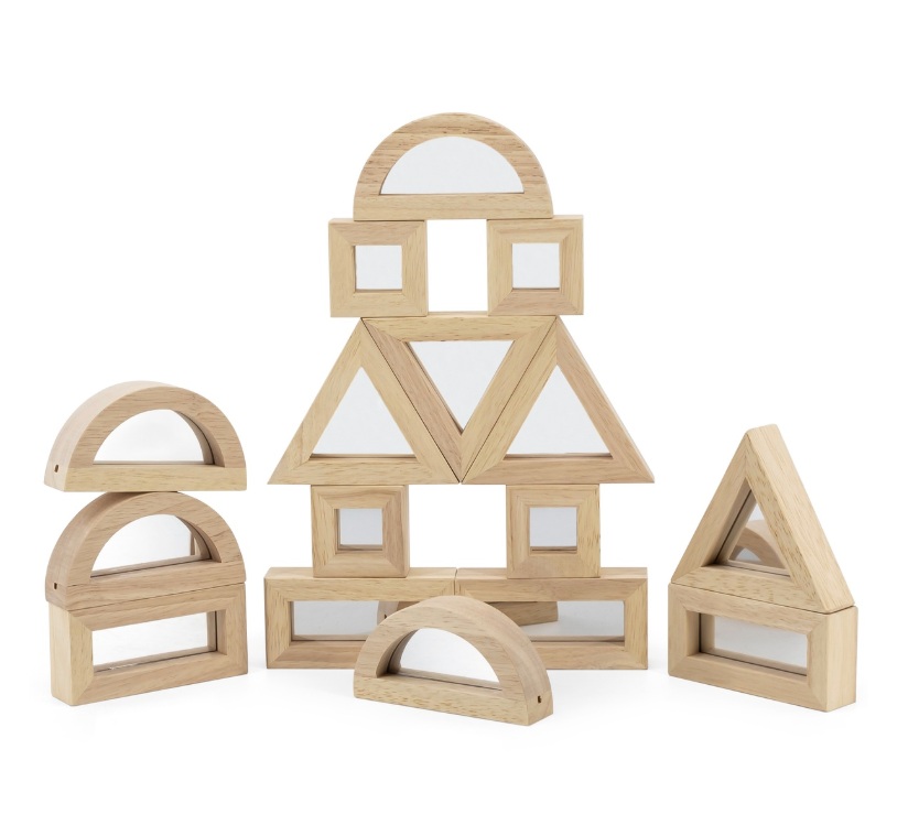 Набор из 16 деревянных зеркальных блоков, предназначенный для развития творческих способностей, зрительного восприятия и мелкой моторики у детей. Каждый блок включает в себя двустороннее акриловое зеркало, предоставляя детям возможность изучать отражения и развивать самосознание.