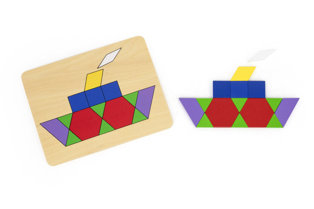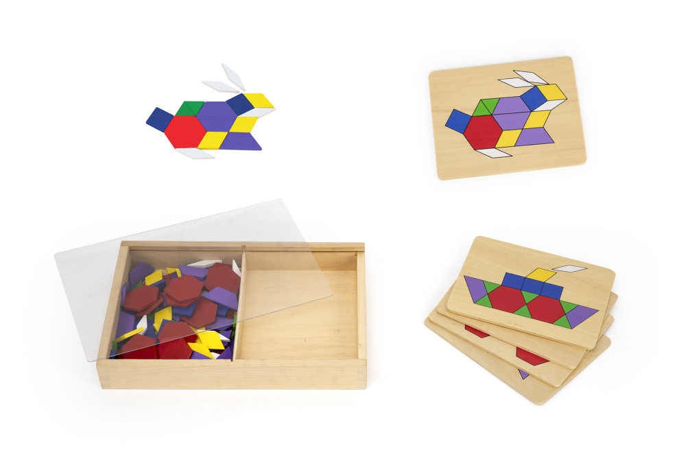 В набор входят 120 деревянных геометрических фигур и 5 деревянных карточек с заданиями.