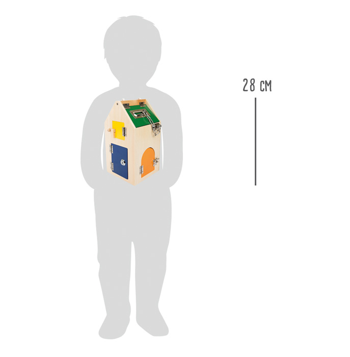 U-образный и цилиндрический замок, различные винты, рычаги, петли и страховочные цепочки тренируют ежедневную моторику.