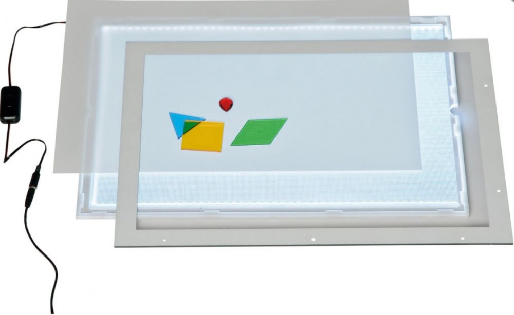 - Световая панель, размер 48 см x 36 см, толщина 1 см. Световая площадь: 44 см x 32 см. Панели можно крепить к стенам как горизонтально, так и вертикально. Также может использоваться для работы на столе;