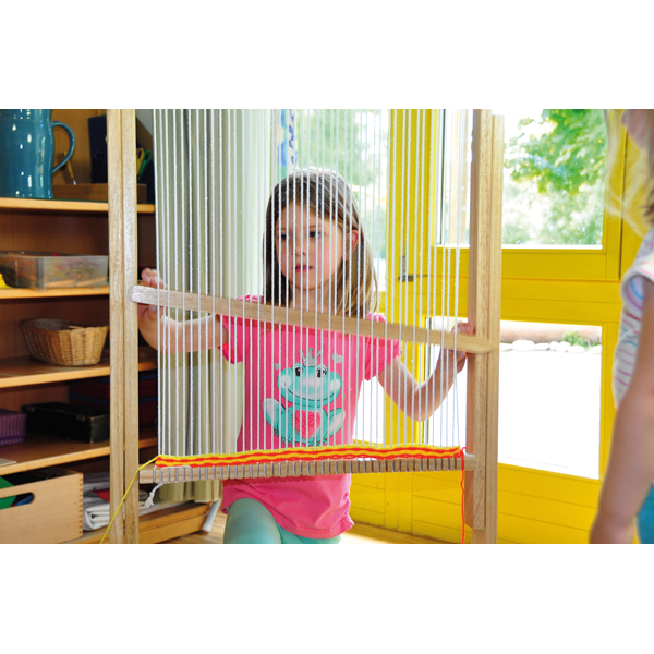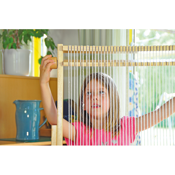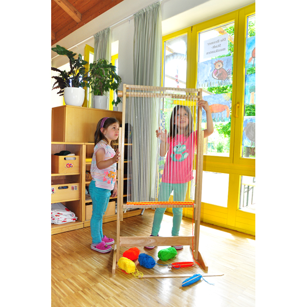 Эта большая ткацкая рама уже натянута. С включенной шерстью вы уже можете плести. Вы также можете работать с травой или другими тканями.