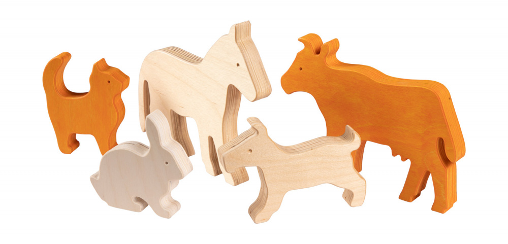 В набор входят: 5 березовых питомцев: лошадь, собака, кролик, корова и кошка.