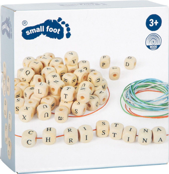 Около 300 деревянных кубиков с буквами, в т.ч. 4 разноцветные ленты. Вы можете создать свои собственные цепочки имен или просто написать слова на столе. Игровое пособие, помогающее выучить буквы алфавита и поощряющее первые попытки детей писать.